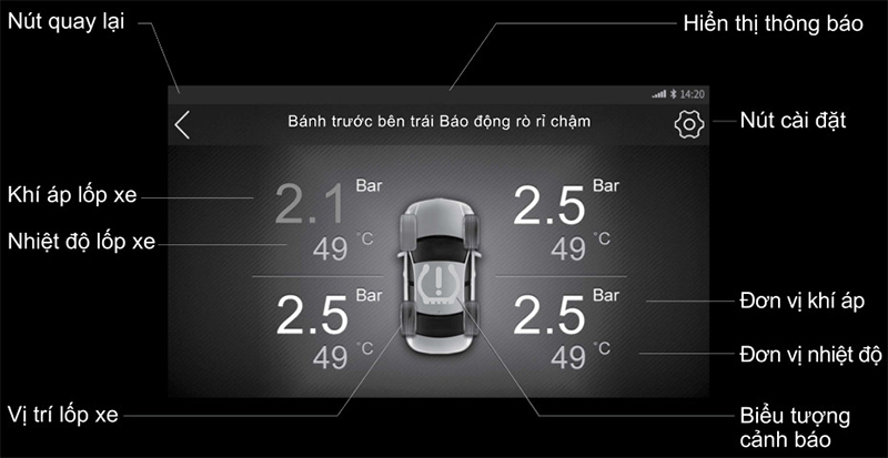 - Giám sát lốp xe theo thời gian thực và hiển thị cảnh báo tức thời trên màn hình của xe