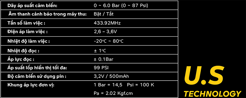 Thông số kỹ thuật : Cảm Biến Áp Suất Lốp Steel mate