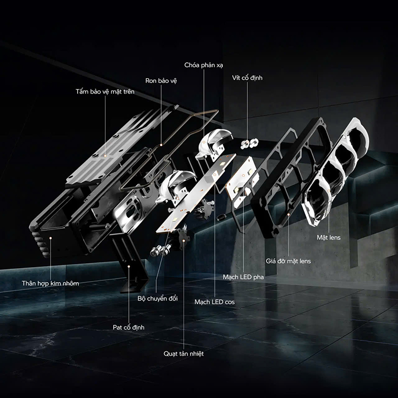 Công nghệ DUAL CUP & DIRECT BEAM với hệ thống 24 nhân LED nhập khẩu chất lượng cao, nâng cao hiệu suất chiếu sáng ấn tượng hơn +200%